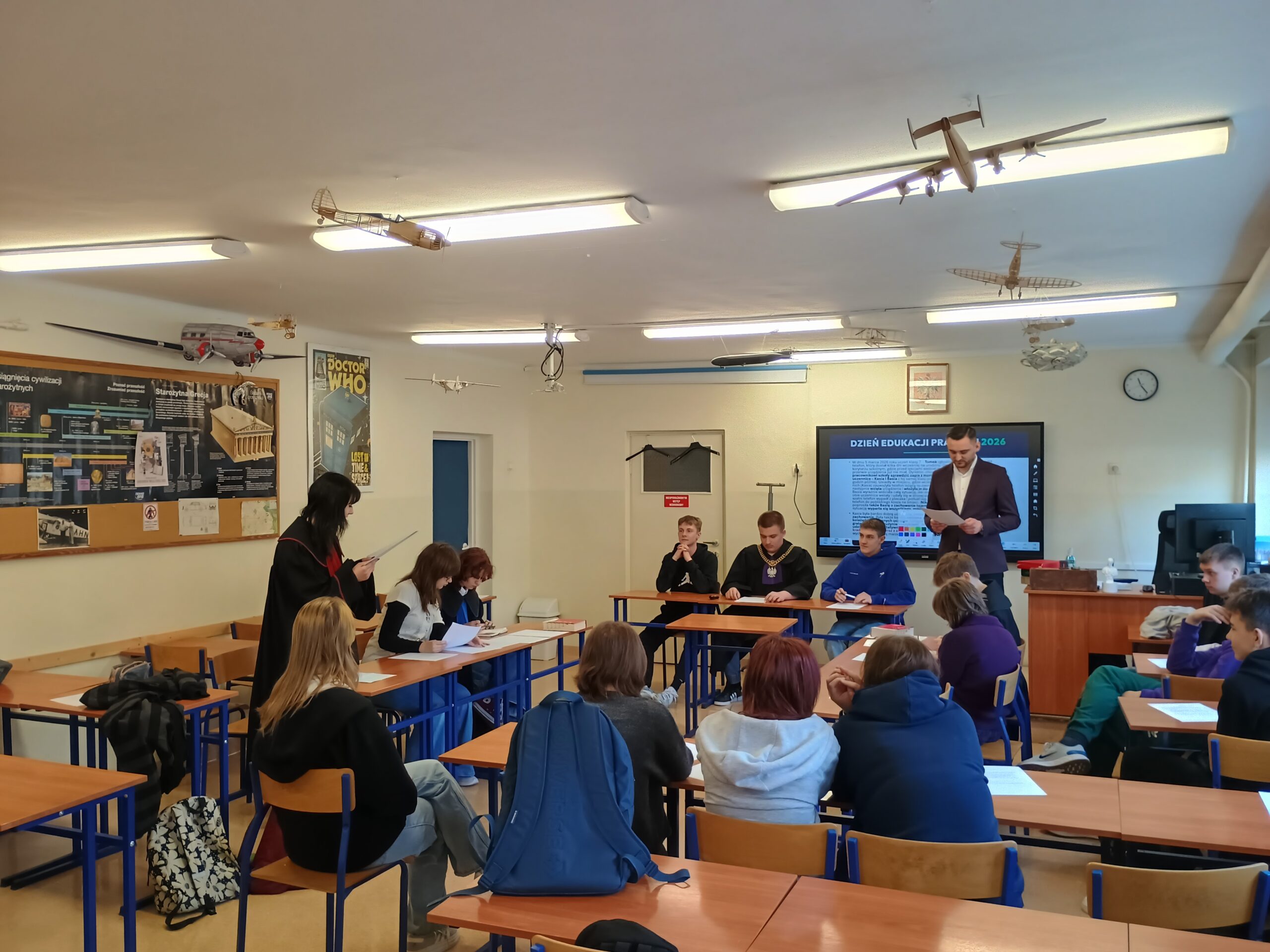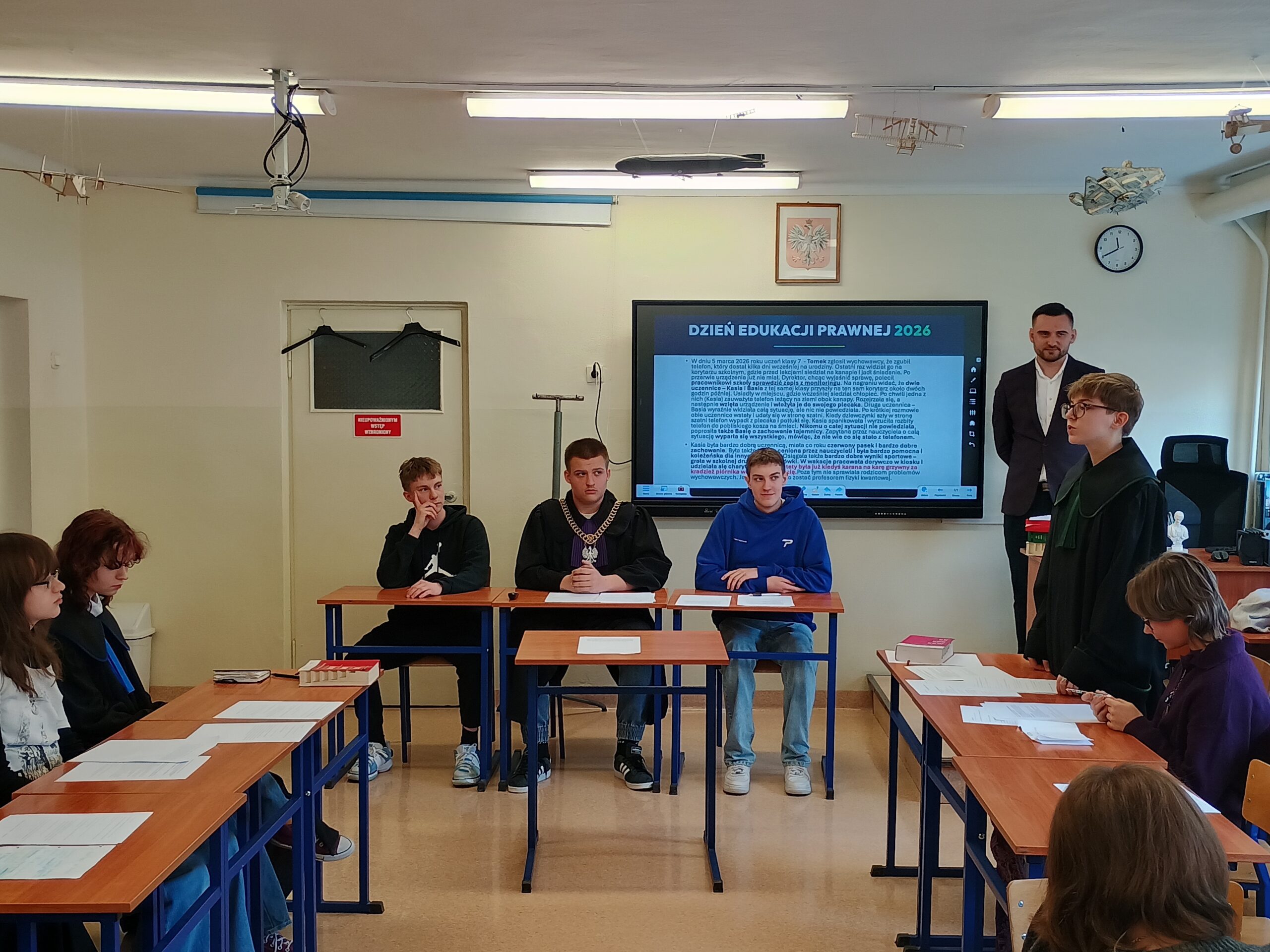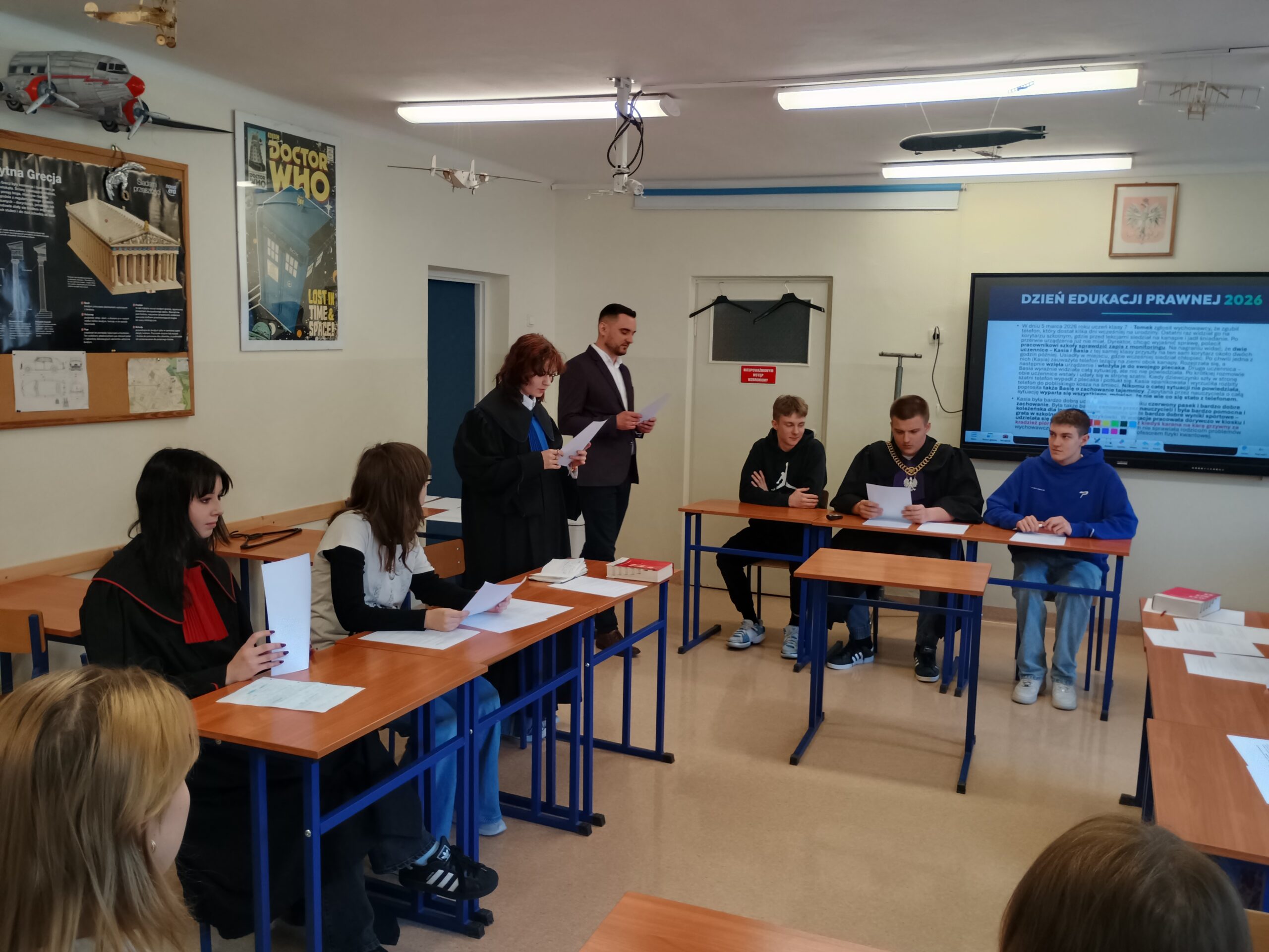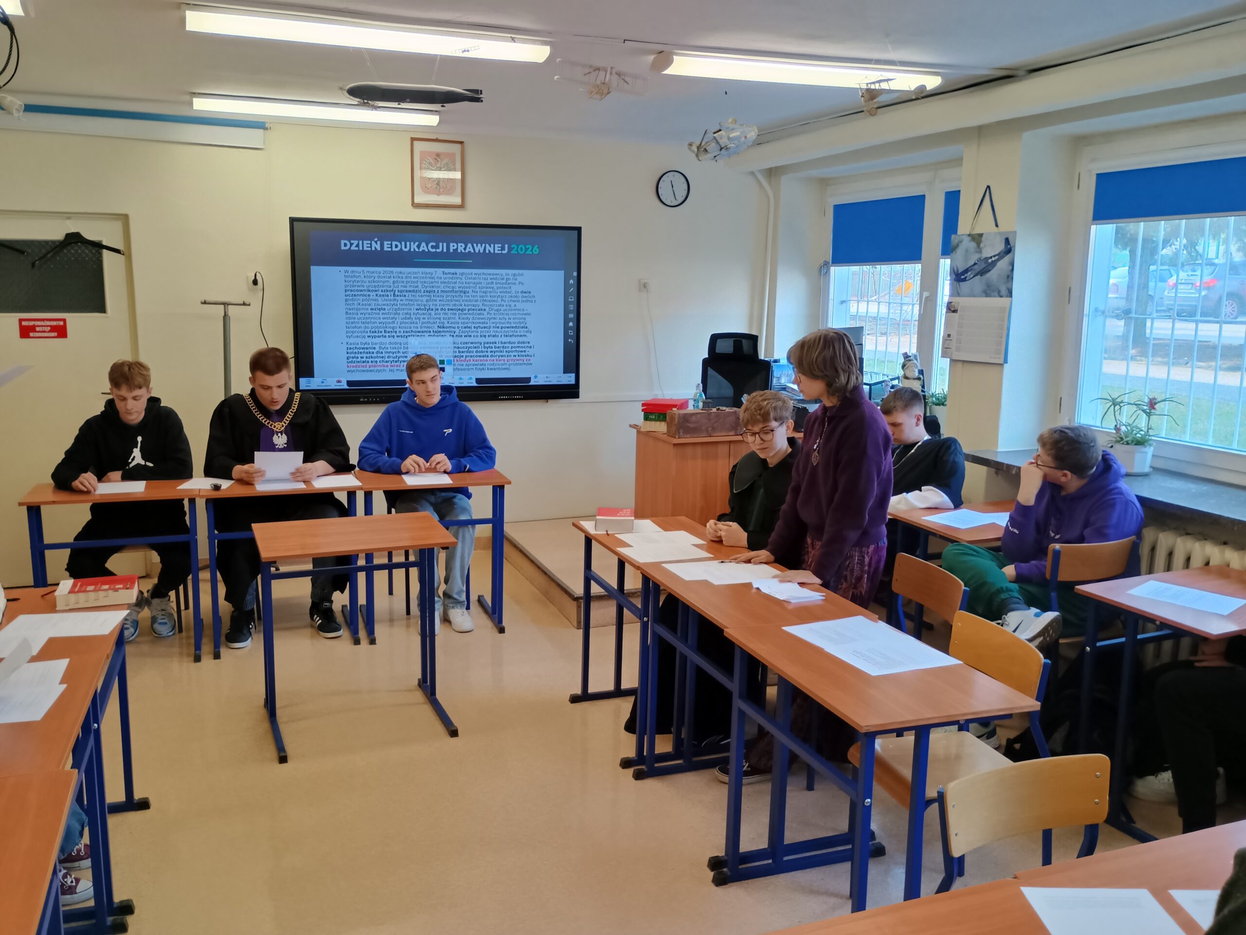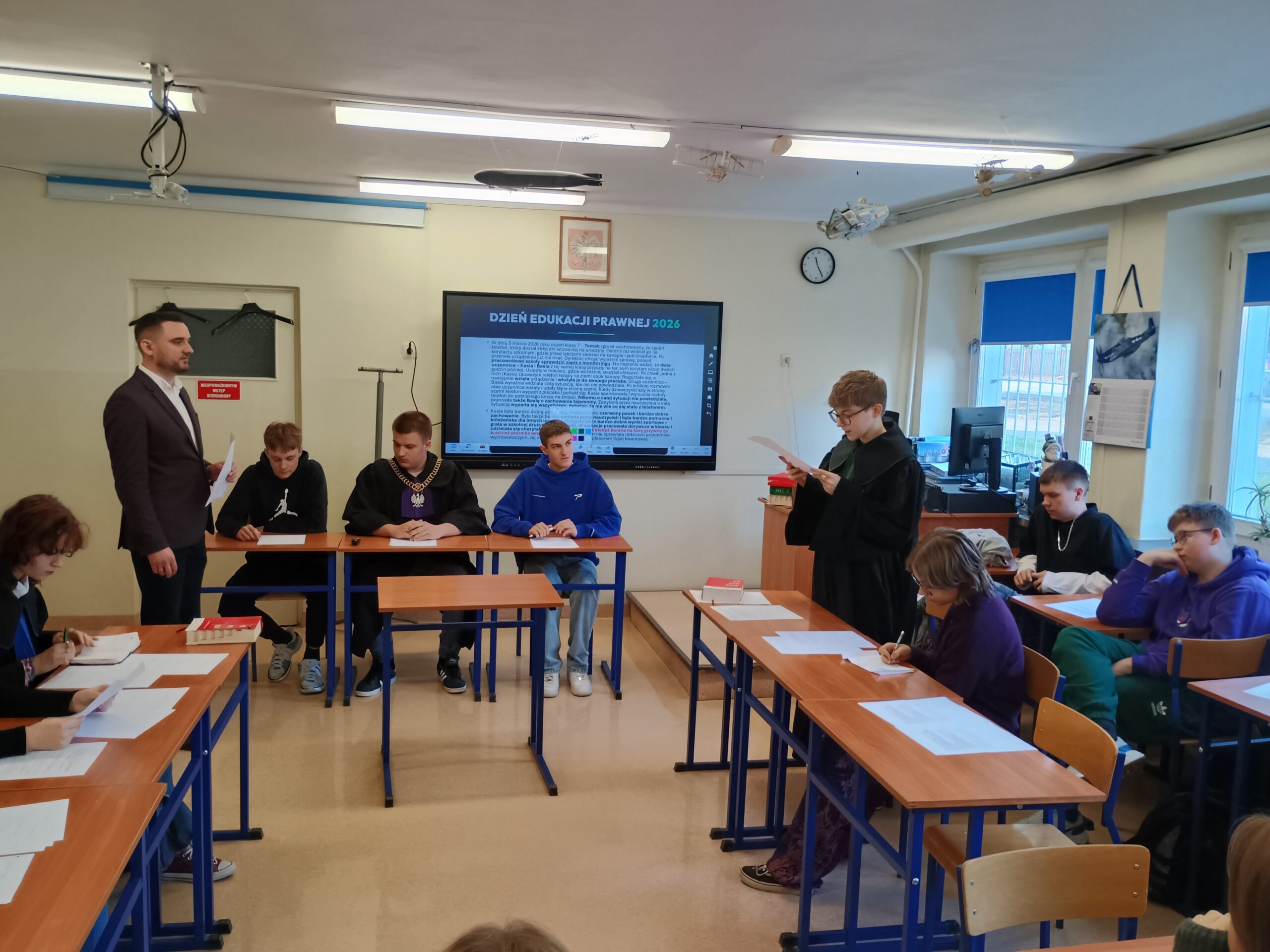 Podczas warsztatów przeprowadzono również symulację rozprawy sądowej, dzięki której uczniowie mogli poznać przebieg procesu oraz wcielić się w role jego uczestników.