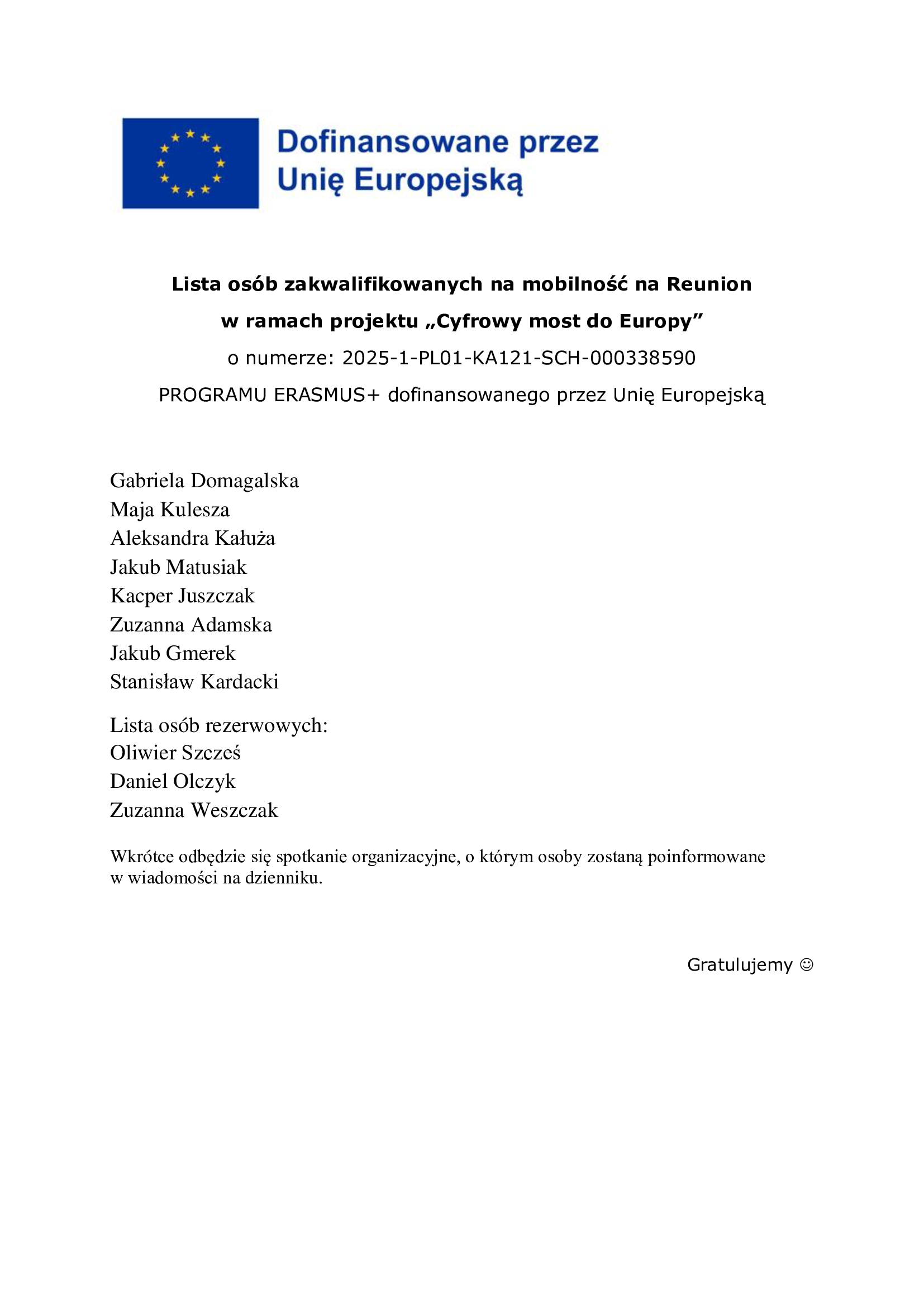 Lista osób zakwalifikowanych na mobilność na REUNION w ramach projektu ” Cyfrowy most do Europy”